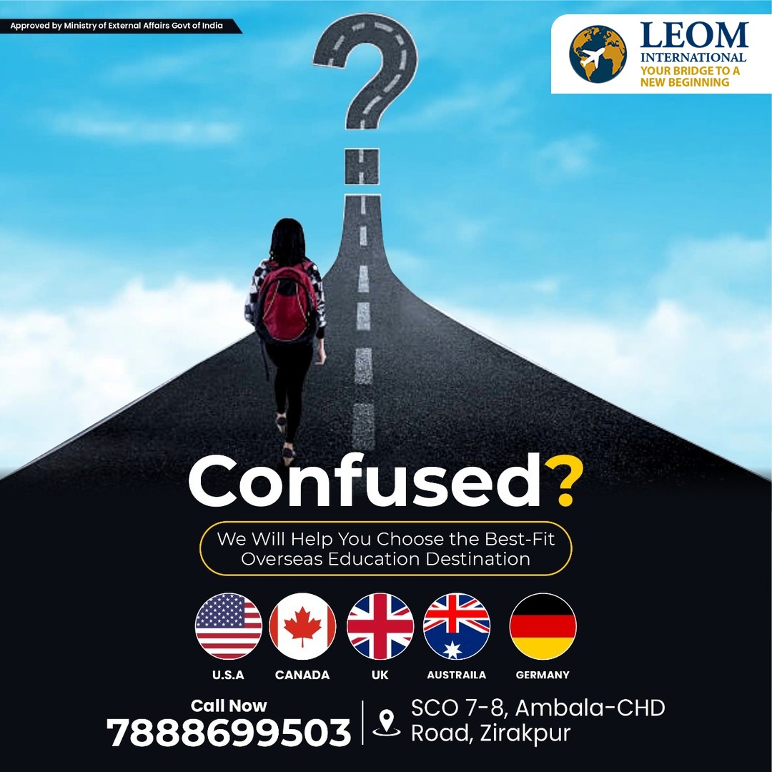 Confused About Studying Abroad? ๐ Donโt worry โ Leom International is here to guide you every step of the way! โ Get expert counselling to choose the right country, university, and course โ Apply hassle-free to top destinations: USA, Canada, UK, Australia, Germany โ Guidance for Study Visa, SOP, Admission Process, & Scholarships โ Approved by the Ministry of External Affairs, Govt. of India ๐ Visit Us: SCO 7โ8, AmbalaโCHD Road, Zirakpur ๐ Call Now: 7888699503 ๐ Start your journey toward a global education today!