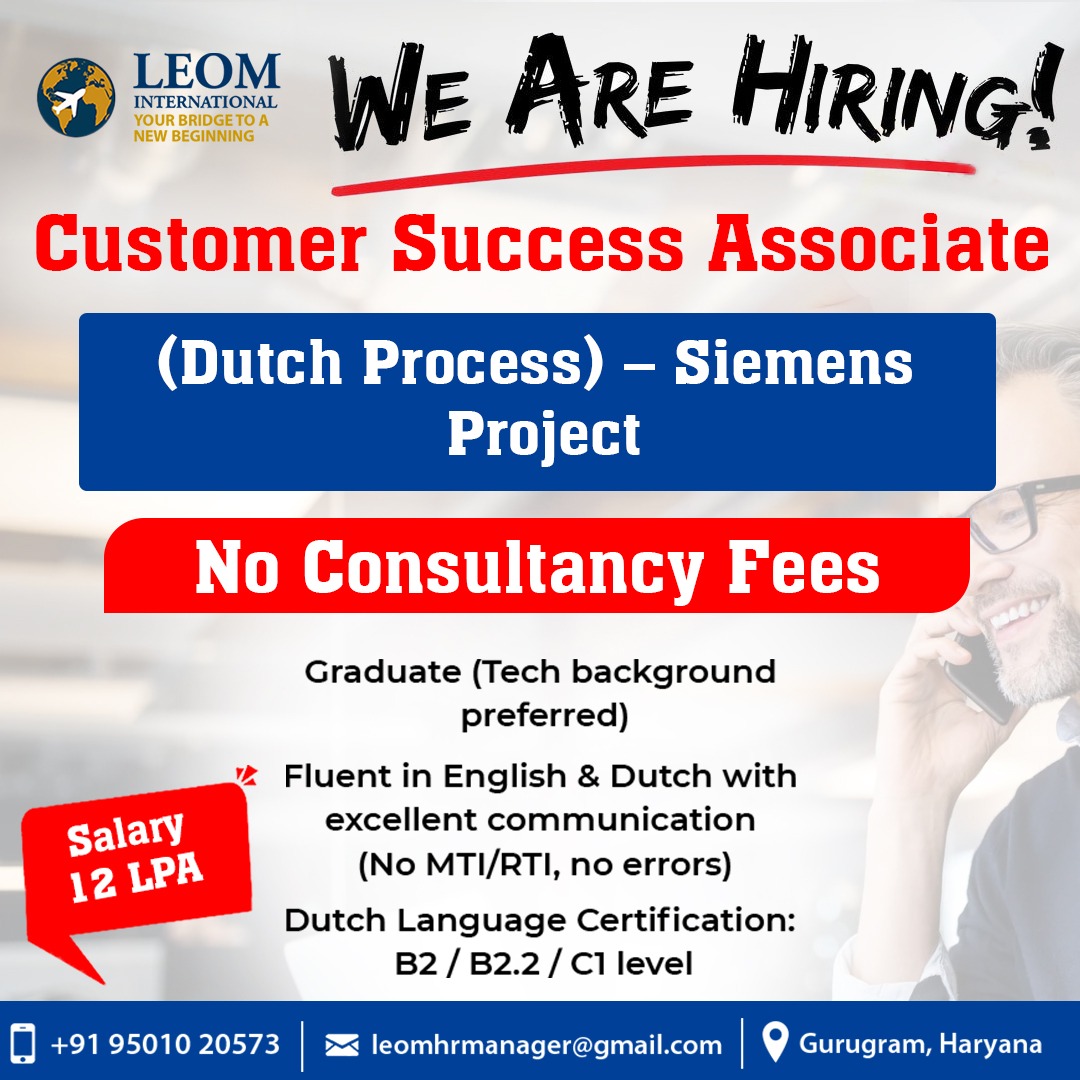 We Are Hiring – Customer Success Associate (Dutch Process) | Siemens Project | Gurugram Transcom is hiring Customer Success Associates – L1 for the Siemens Dutch Process in Gurugram. This is a direct company hiring with no consultancy fees. If you are fluent in English and Dutch, have strong communication skills, and are looking for an international process career, this is your chance! ✅ Job Highlights Position: Customer Success Associate – L1 Process: International (Dutch) | Siemens Project Location: Gurugram, Haryana Work Mode: Work From Office (WFO) Openings: 10 Salary: Up to ₹12 LPA Shift: Rotational (Male & Female) Cab Facility: Available 🎯 Key Responsibilities Handle customer assistance and issue resolution Document customer interactions accurately Provide end-to-end resolution for client queries 🛠️ Eligibility Criteria Graduate (Tech background preferred) Fluent in English & Dutch (No MTI/RTI, no grammatical errors) Dutch Language Certification: B2 / B2.2 / C1 Minimum 1 year international process experience 🚀 Why Join Us? Direct company hiring – No Consultancy Fees Opportunity to work with global Siemens project Excellent career growth in international customer success 📩 Apply Now: leomhrmanager@gmail.com 📞 Contact: +91 95010 20573 📍 Location: Gurugram, Haryana