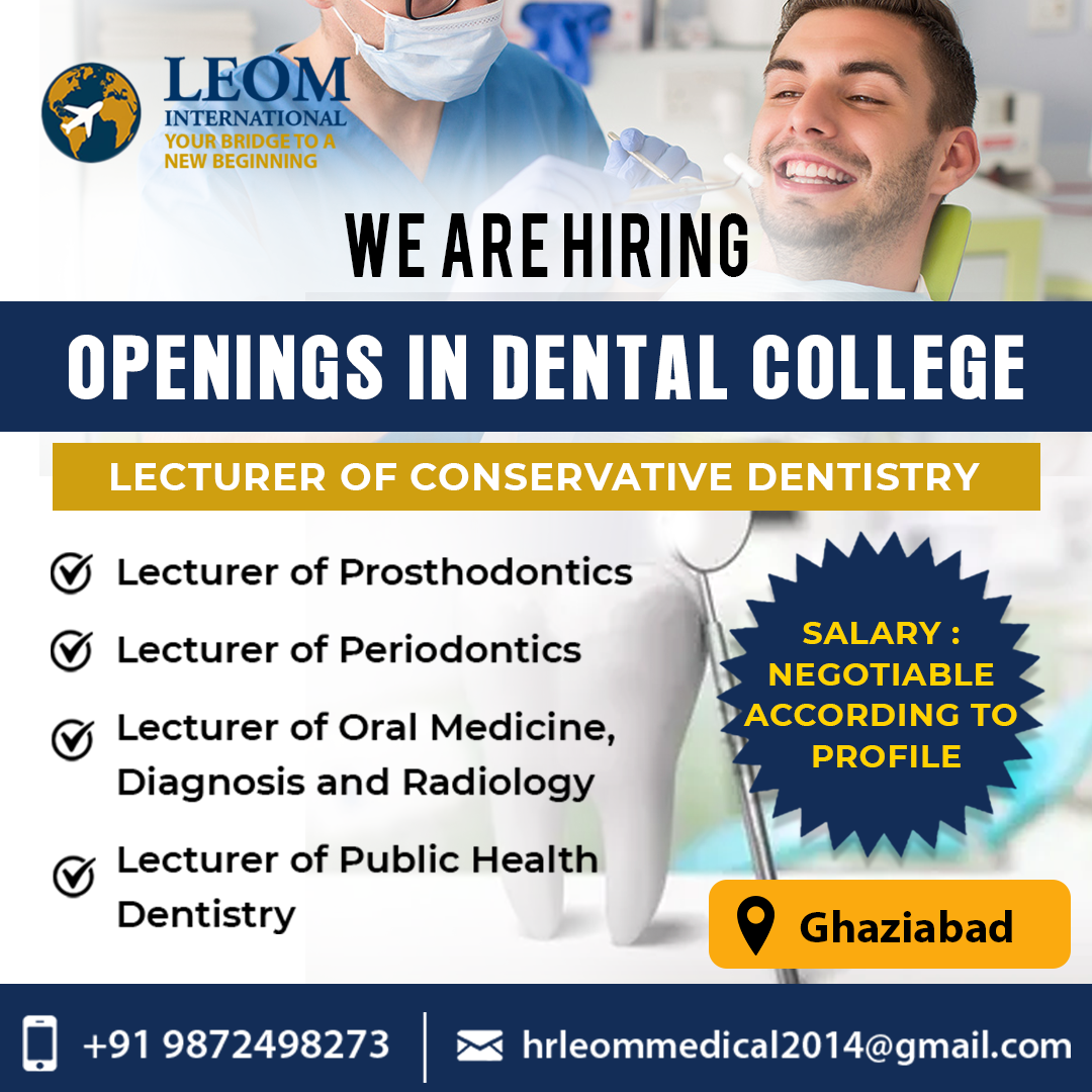 We Are Hiring – Dental College Faculty Openings in Ghaziabad! Leom International is inviting applications for Lecturer positions in reputed Dental Colleges across Ghaziabad. If you are passionate about teaching and shaping the next generation of dental professionals, this is your opportunity! 💼 Open Positions: Lecturer of Conservative Dentistry Lecturer of Prosthodontics Lecturer of Periodontics Lecturer of Oral Medicine, Diagnosis, and Radiology Lecturer of Public Health Dentistry 💰 Salary: Negotiable as per experience and profile 📍 Location: Ghaziabad 📞 Contact Us: 📱 +91 98724 98273 📧 hrleommedical2014@gmail.com