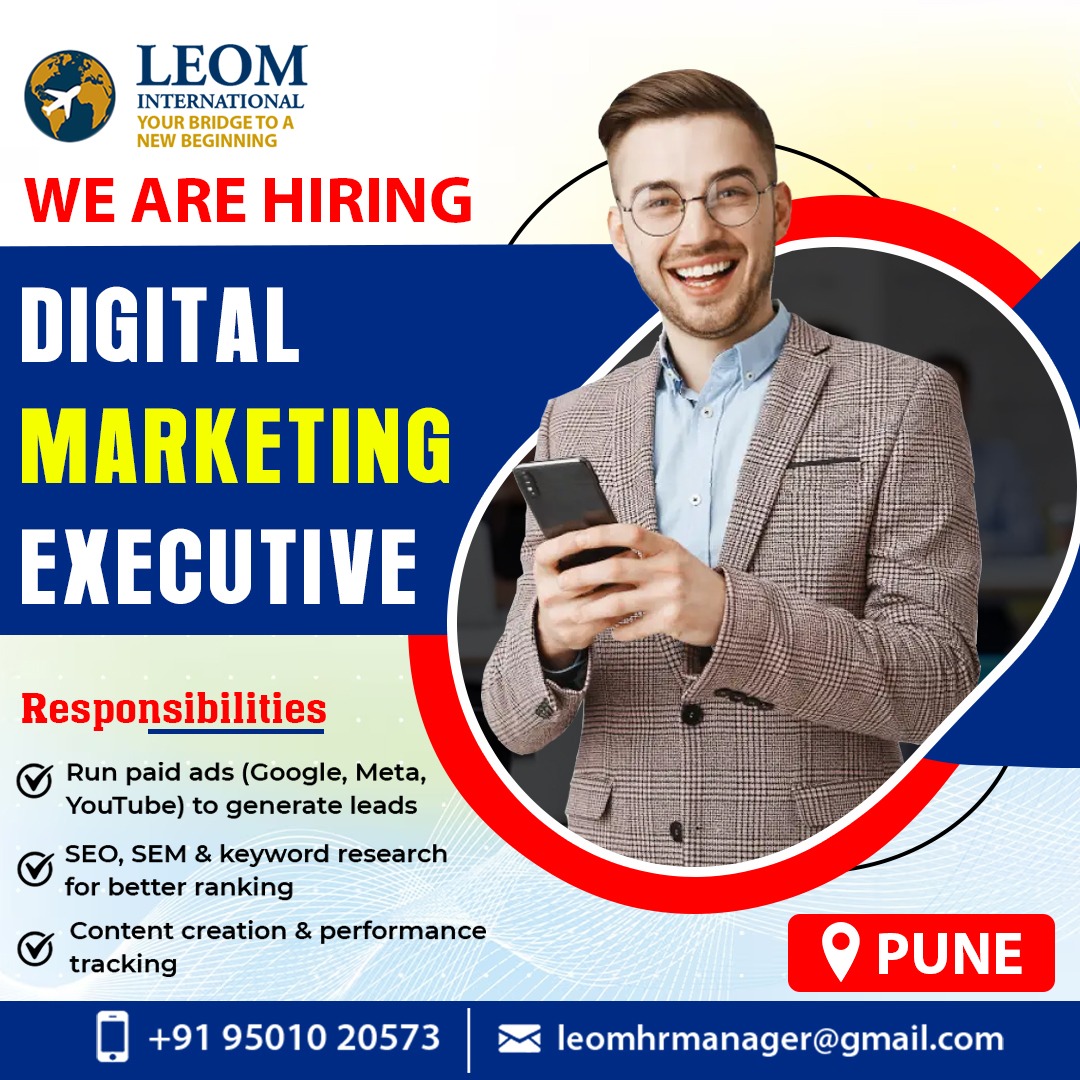 🚀 Leom International is Hiring – Digital Marketing Executive in Pune 🚀 Are you passionate about digital marketing, SEO, SEM, and social media campaigns? Join our team as a Digital Marketing Executive and take your career to the next level. 📍 Location: Pune 💼 Position: Digital Marketing Executive 👩💻 Experience: 1–3 Years (Freshers with strong skills can also apply) ✨ Key Responsibilities: ✔ Run paid ads on Google, Meta (Facebook & Instagram), and YouTube to generate quality leads ✔ SEO, SEM & keyword research to boost website ranking ✔ Content creation, social media management & performance tracking ✅ Desired Skills: Knowledge of Google Ads, Facebook Ads & YouTube Marketing Strong understanding of SEO, SEM, and analytics tools Creative thinking with problem-solving skills Excellent communication & teamwork 📩 Apply Now: Send your resume at leomhrmanager@gmail.com 📞 Contact: +91 95010 20573 Grow your career with Leom International – Your Bridge to a New Beginning 🌍