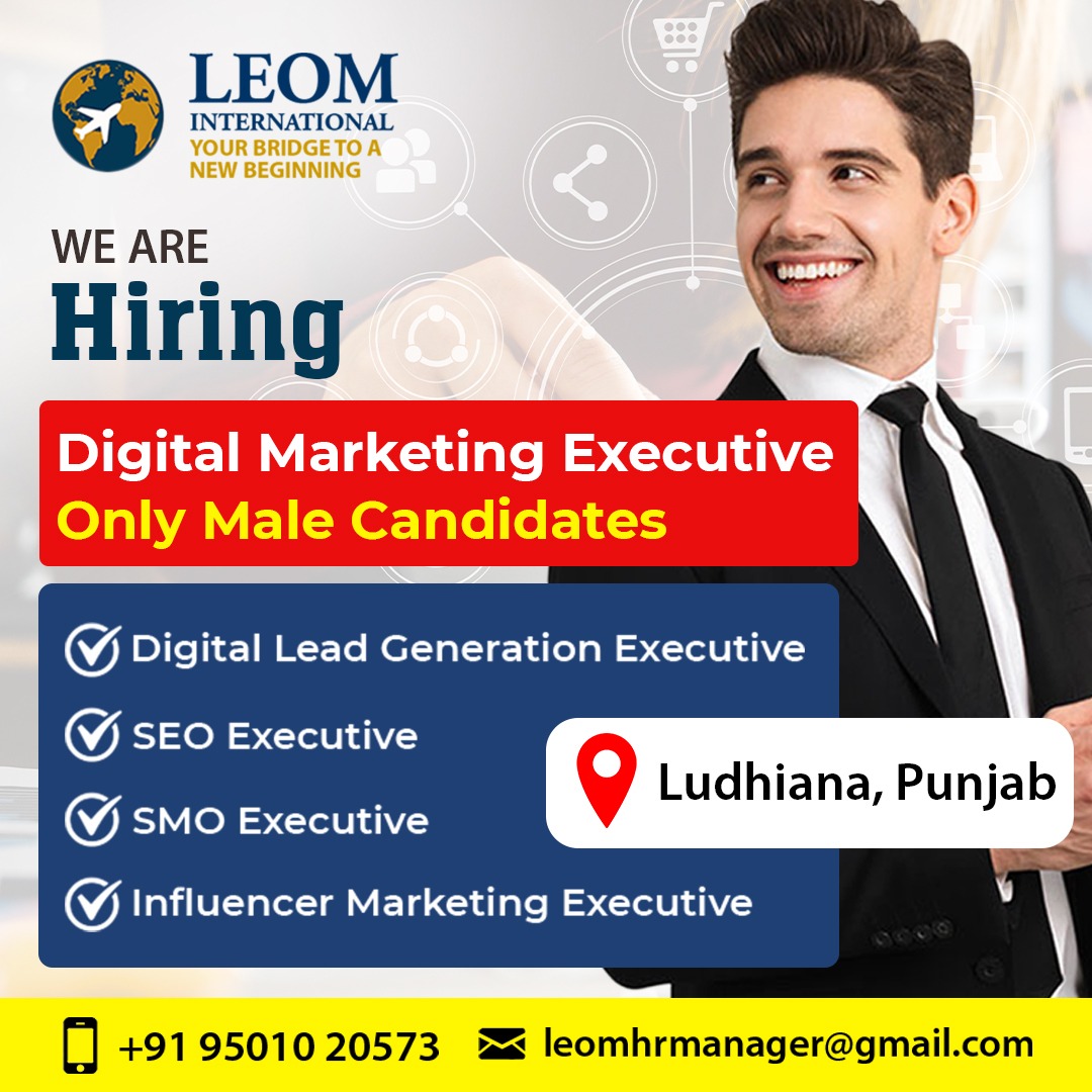 Digital Marketing Executive | Only Male Candidates | Ludhiana, Punjab LEOM International is hiring talented and passionate Digital Marketing Executives to join our growing team in Ludhiana, Punjab. If you are someone who loves working with SEO, SMO, Influencer Marketing, and Lead Generation – this is the right opportunity for you! Available Positions: ✅ Digital Lead Generation Executive ✅ SEO Executive ✅ SMO Executive ✅ Influencer Marketing Executive Eligibility: Only Male Candidates can apply Graduate in Marketing/IT/Business or equivalent Strong knowledge of SEO, SMO, and Digital Marketing strategies Excellent communication & analytical skills Freshers and candidates with up to 2 years of experience are welcome Key Responsibilities: Generate quality leads through digital channels Execute SEO strategies (On-page, Off-page, Technical SEO) Manage and optimize social media platforms (Facebook, Instagram, LinkedIn, etc.) Handle influencer outreach & marketing campaigns Track, analyze, and report performance of campaigns Why Join Us? Competitive Salary & Growth Opportunities Professional Work Environment Exposure to Live Projects & Campaigns 📍 Location: Ludhiana, Punjab 📞 Contact: +91 95010 20573 📩 Email: leomhrmanager@gmail.com