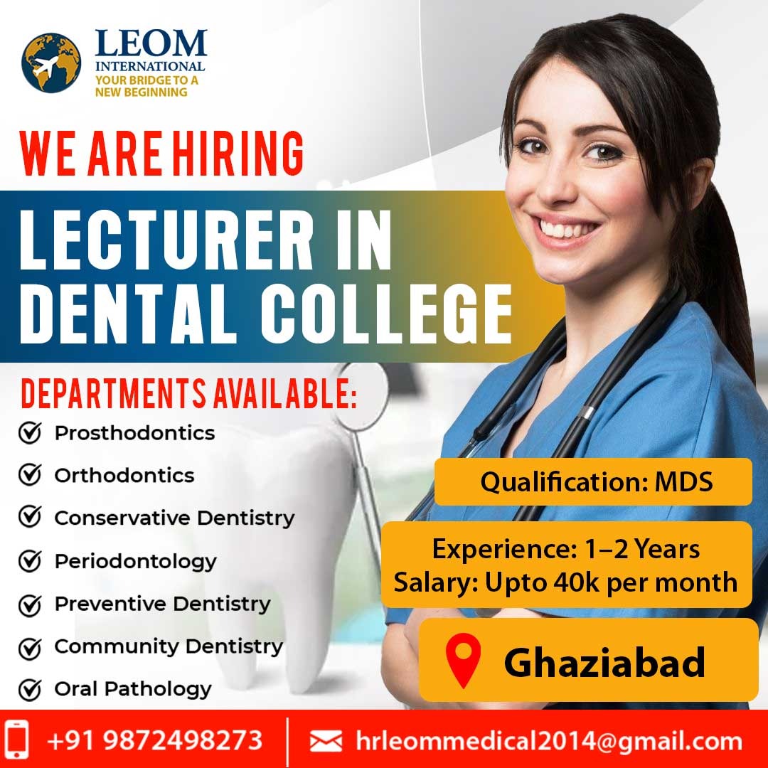 We Are Hiring – Lecturer for Dental College in Ghaziabad | Leom International Leom International invites applications for the position of Lecturer in a reputed Dental College in Ghaziabad. We are looking for passionate and qualified dental professionals who wish to build a rewarding teaching career in dentistry. 📌 Departments Available: Prosthodontics Orthodontics Conservative Dentistry Periodontology Preventive Dentistry Community Dentistry Oral Pathology 📌 Job Details: Location: Ghaziabad, India Experience Required: 1–2 Years Salary Offered: ₹40, 000 per month This is an excellent opportunity for dental professionals to contribute to the growth of future dentists while advancing their own academic career. 👉 If you are looking for Dental Lecturer Jobs in Ghaziabad with the best career growth opportunities, apply now with Leom International. 📞 Contact: +91 9872498273 📧 Email: hrleommedical2014@gmail.com