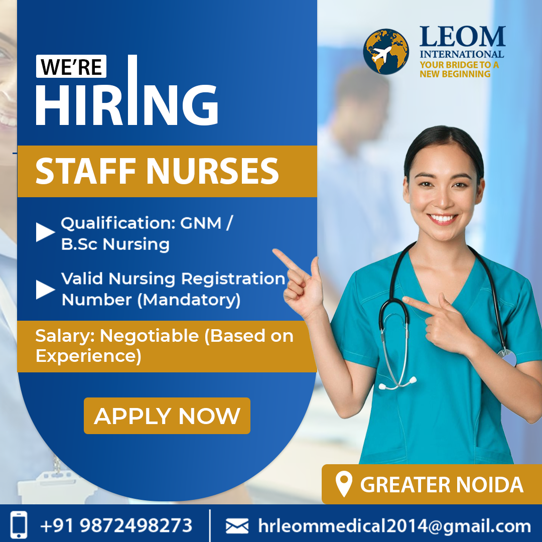 Join Leom International – We’re Hiring Staff Nurses in Greater Noida! Are you a qualified GNM or B.Sc Nursing professional looking for a rewarding career opportunity? Leom International is hiring Staff Nurses to join our reputed medical teams in Greater Noida. ✅ Eligibility Criteria: Qualification: GNM / B.Sc Nursing Valid Nursing Registration Number (Mandatory) 💰 Salary: Negotiable (Based on Experience) 📍 Location: Greater Noida If you are passionate about patient care and want to grow your career in a supportive healthcare environment, this is your chance! 📞 Contact Us: +91 9872498273 📧 Email: hrleommedical2014@gmail.com
