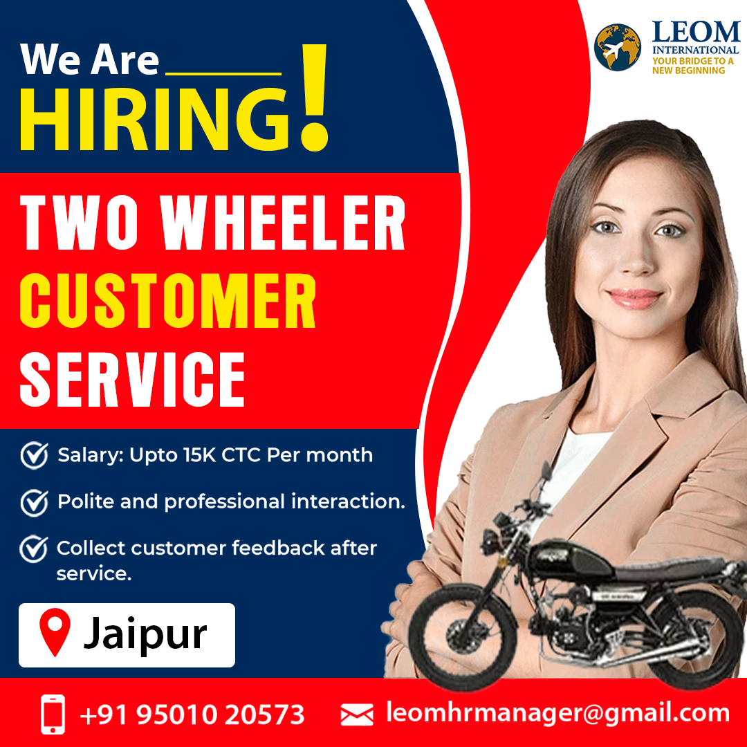 Join Our Team as a Two-Wheeler Customer Service Executive – Jaipur Leom International is hiring dedicated and customer-focused Two-Wheeler Customer Service Executives to join our dynamic team in Jaipur. 👉 Position: Two-Wheeler Customer Service Executive 📍 Location: Jaipur 💼 Salary: Up to ₹15, 000 CTC Per Month 📞 Contact: +91 95010 20573 📧 Email: leomhrmanager@gmail.com ✅ Key Responsibilities: Provide polite and professional customer interactions Assist customers with two-wheeler related inquiries and services Collect and record valuable customer feedback after service interactions 🌟 Why Work With Us? Competitive salary package Opportunity to grow in a supportive work environment Enhance your communication and problem-solving skills 🚀 Apply Today and be part of Leom International – Your Bridge to a New Beginning! 🔔 Follow us for more job updates and career opportunities. 📍 Visit us: Jaipur