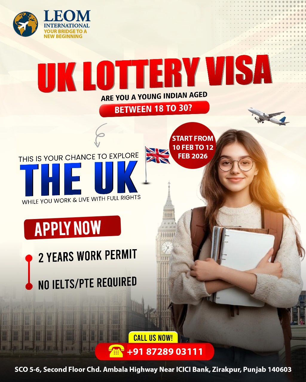 UK Lottery Visa – Work & Live in the UK Legally Are you a young Indian looking to build your future in the United Kingdom? The UK Lottery Visa gives you a golden opportunity to work and live in the UK with full legal rights. This program is specially designed for eligible candidates aged 18 to 30 years, offering a 2-year work permit without the need for IELTS or PTE. This is your chance to explore global career opportunities, gain international work experience, and enjoy a better lifestyle in the UK. 🔹 Key Benefits of UK Lottery Visa ✅ 2 Years UK Work Permit ✅ No IELTS / PTE Required ✅ Live & Work Legally in the UK ✅ Open Work Rights ✅ Ideal for Young Indians (18–30 Years) ✅ Simple & Transparent Process 🔹 Application Dates 🗓 Applications Open: 10 February to 12 February 2026 ⚠️ Limited slots available – early application is highly recommended. 🔹 Why Choose LEOM International? LEOM International is a trusted immigration consultancy providing professional visa guidance, accurate documentation, and end-to-end support. Our experienced counselors ensure a smooth and hassle-free application process for your UK Lottery Visa. 🔹 Apply Now for UK Lottery Visa Take the first step towards your UK dream career today. 📞 Call Us Now: +91 87289 03111 📍 SCO 5-6, Second Floor, Chandigarh-Ambala Highway, Near ICICI Bank, Zirakpur, Punjab 140603